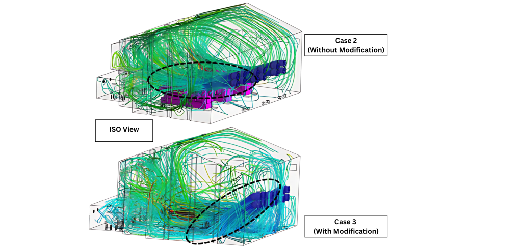 The study analysed multiple scenarios, focusing on how supply and exhaust fan placement impacted air circulation and heat buildup. The base case simulations revealed high temperature zones near the alternator and engine bodies, indicating insufficient cooling due to inadequate airflow distribution. Adjustments were made by modifying the supply fan duct angles, improving airflow direction towards heat-sensitive components.