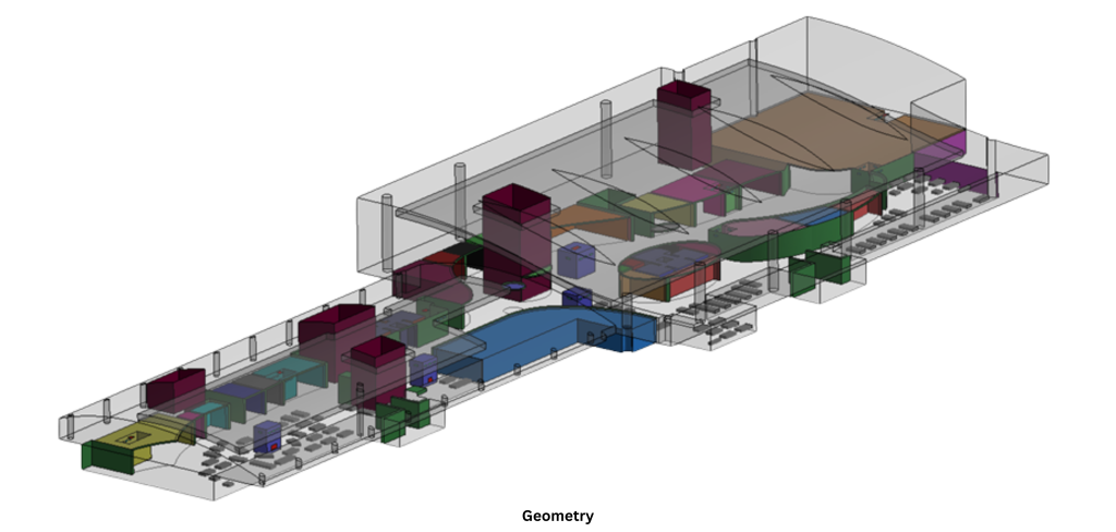 The findings from the CFD study provided valuable insights into optimizing the airport’s HVAC system, ensuring efficient air circulation, temperature regulation, and energy efficiency. Recommendations included adjusting airflow rates, modifying AHU outlet positioning, and implementing additional ventilation controls to enhance thermal comfort and system performance while maintaining energy-efficient operations.