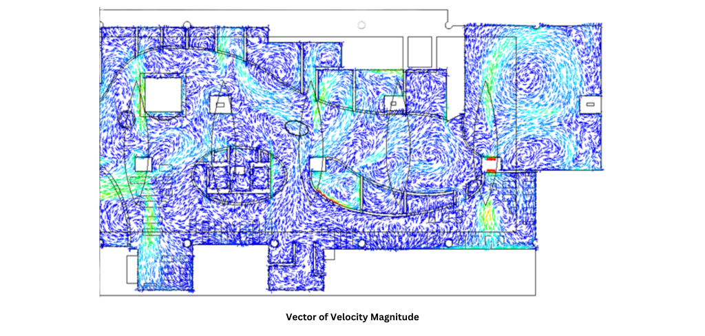The ventilation mode simulation evaluated airflow patterns, identifying potential dead zones where stagnant air could accumulate. The study ensured that the existing ventilation system effectively distributed fresh air, maintaining optimal indoor air quality. The analysis included assessing supply and exhaust configurations, flow rates, and velocity profiles at different heights to verify compliance with industry standards.