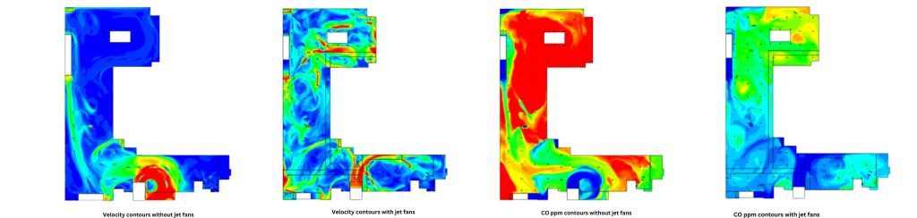 A Computational Fluid Dynamics (CFD) study was conducted to evaluate the effectiveness of the ventilation system in an enclosed car park, focusing on air quality, pollutant dispersion, and fire safety. The analysis aimed to optimize jet fan placement and improve the overall airflow distribution to maintain safe CO levels and ensure effective smoke evacuation in case of a fire.